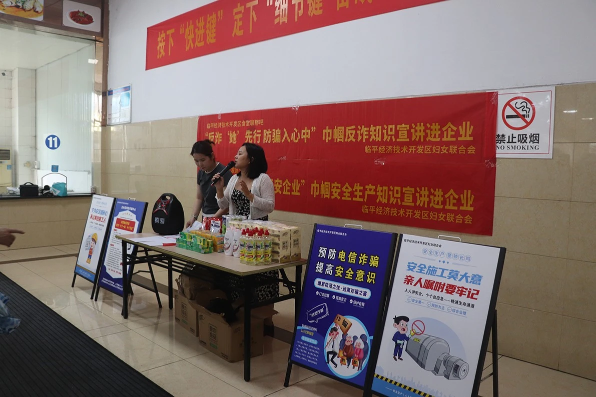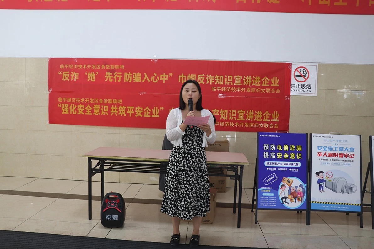 活动现场,首先,临平经济开发区妇联的宣讲员们通过生动的案例、通俗易懂的语言,详细介绍了常见的诈骗手段和防范方法。从网络诈骗到电信诈骗,从投资理财诈骗到冒充熟人诈骗,宣讲员们一一剖析,让员工们深刻认识到诈骗的多样性和危害性。同时,宣讲员们还与现场员工互动,分享了如何识别诈骗信息、如何保护个人信息安全等实用技巧,引导员工们在日常生活中保持警惕,遇到可疑情况及时报警。